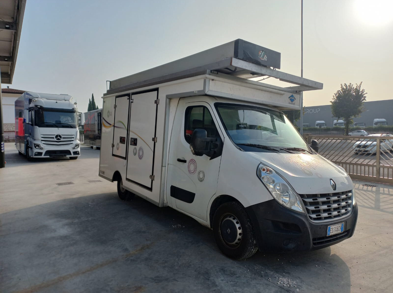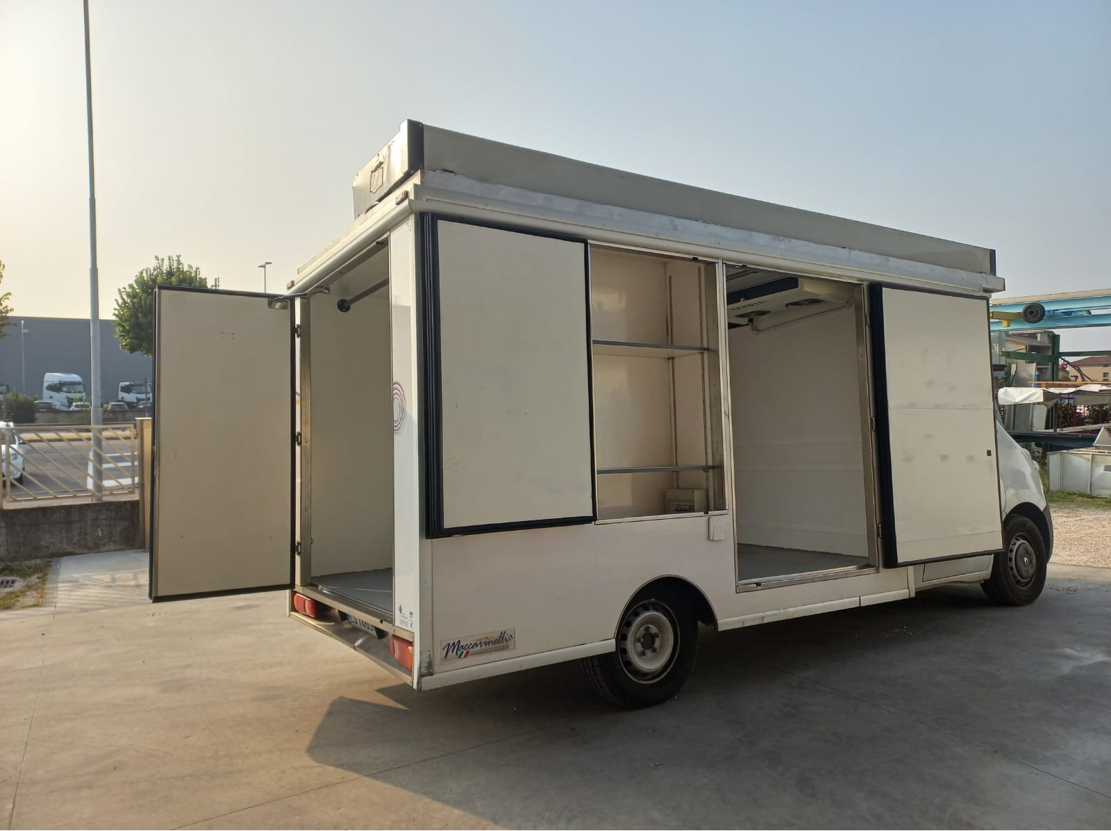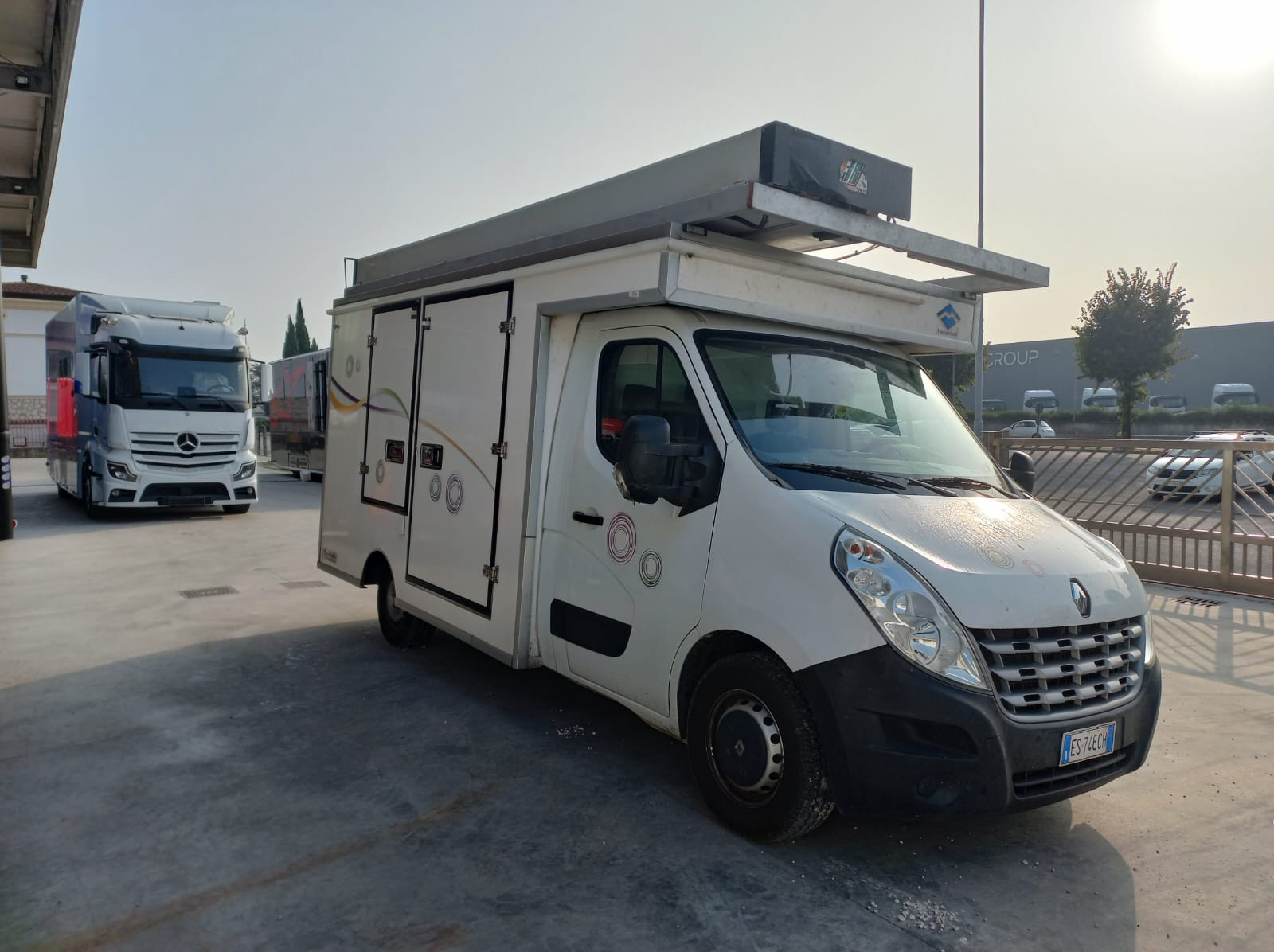 Autonegozio Maccarinelli su Renault Master 2.5, 150 HP, anno 2013. Furgone con n° 2 porte laterali destre e n° 2 porte posteriori a libro. Arredamento interno adibito a vendita abbigliamento. Tenda automatica 3B riducibile sui due lati con apertura sul lato destro.