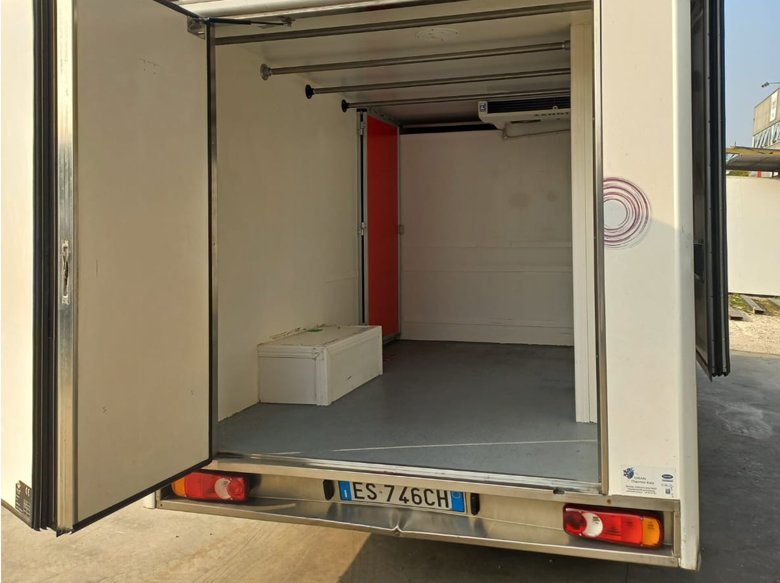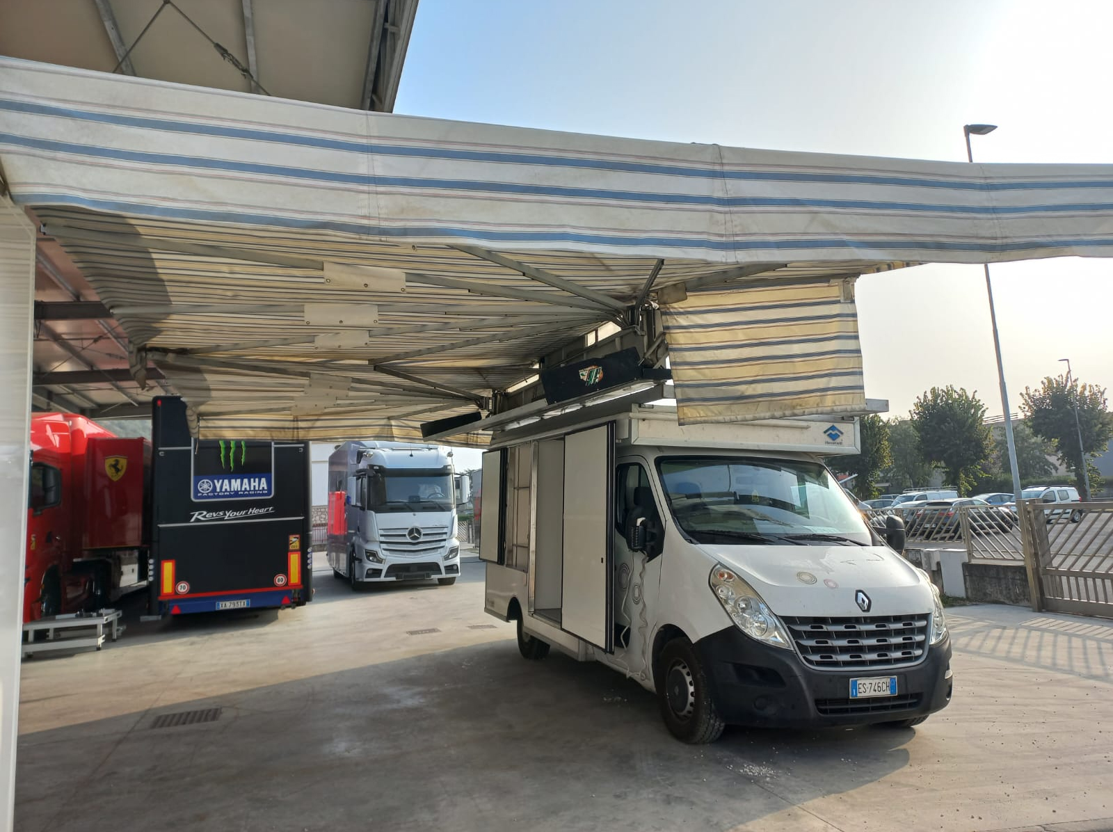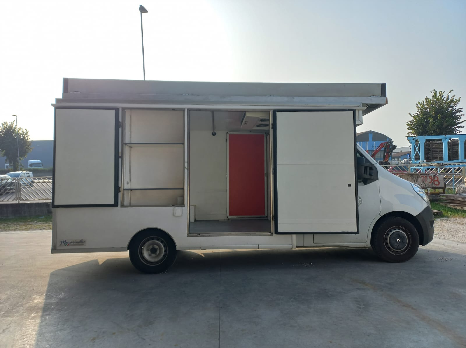 Autonegozio Maccarinelli su Renault Master 2.5, 150 HP, anno 2013. Furgone con n° 2 porte laterali destre e n° 2 porte posteriori a libro. Arredamento interno adibito a vendita abbigliamento. Tenda automatica 3B riducibile sui due lati con apertura sul lato destro.